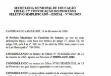 A Secretaria Municipal de Educação de Candeias do Jamari (RO) divulgou, nesta terça-feira, 13 de fevereiro de 2026, a Vigésima…