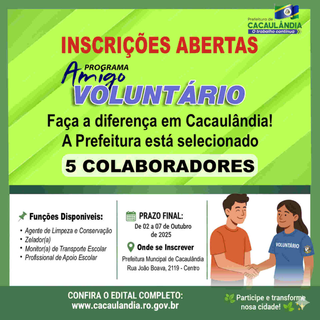 A Prefeitura de Cacaulândia (RO) publicou o Edital nº 001/2025, que regulamenta o Processo Seletivo Simplificado para o Programa Amigo Voluntário. O certame visa a seleção de candidatos para atuação em diferentes secretarias municipais, conforme a demanda de serviços de apoio à administração pública.