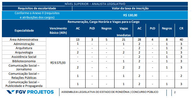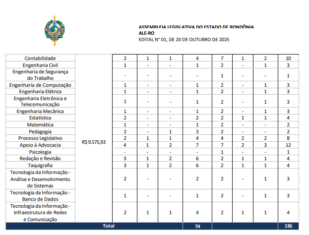 A Assembleia Legislativa de Rondônia divulgou o quadro completo de vagas do concurso com oportunidades para níveis médio e superior em diversas áreas do Legislativo estadual.