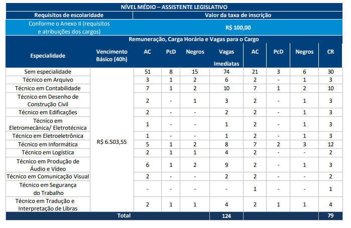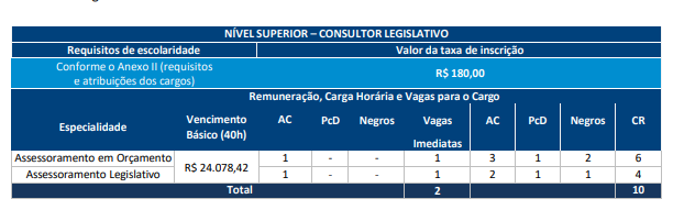 O quadro de vagas foi estruturado para atender diferentes áreas administrativas, técnicas e legislativas, garantindo oferta para candidatos com formações variadas.