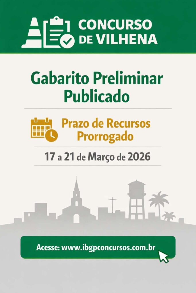 O Instituto Brasileiro de Gestão Pública e Pesquisa (IBGP) publicou, nesta segunda-feira (16), o gabarito preliminar das provas objetivas do concurso público da Prefeitura de Vilhena, em Rondônia. O documento refere-se ao certame para o cargo de Agente Municipal de Trânsito, etapa fundamental para os candidatos que buscam a estabilidade e uma carreira pública no setor de segurança viária.