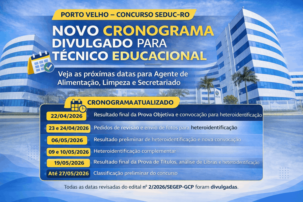 PORTO VELHO – O Governo do Estado de Rondônia publicou nesta quarta-feira (15) a atualização do Anexo II – Cronograma Previsto do Edital nº 2/2026/SEGEP-GCP. O documento detalha as etapas restantes do concurso público para Técnico Educacional, que oferece vagas de Agente de Limpeza e Conservação, Agente de Alimentação e Agente de Atividades de Secretariado na Secretaria de Estado da Educação (SEDUC).