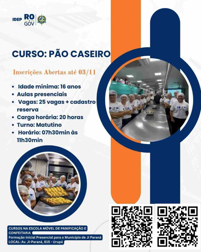 O Governo do Estado de Rondônia anunciou a abertura das inscrições para os cursos presenciais gratuitos da Escola Móvel de Panificação e Confeitaria, voltados à formação inicial profissional no município de Ji-Paraná (RO). As inscrições começaram em 29 de outubro e seguem abertas até 3 de novembro de 2025, de forma totalmente online.