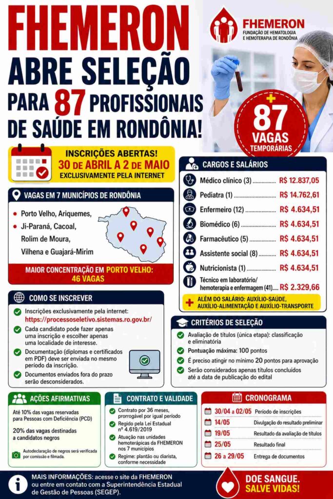 Porto Velho — A Fundação de Hematologia e Hemoterapia de Rondônia (FHEMERON) lançou nesta segunda-feira (27) um edital para preenchimento de 87 vagas temporárias em diferentes áreas da saúde. As inscrições abrem no dia 30 de abril e encerram no dia 2 de maio.