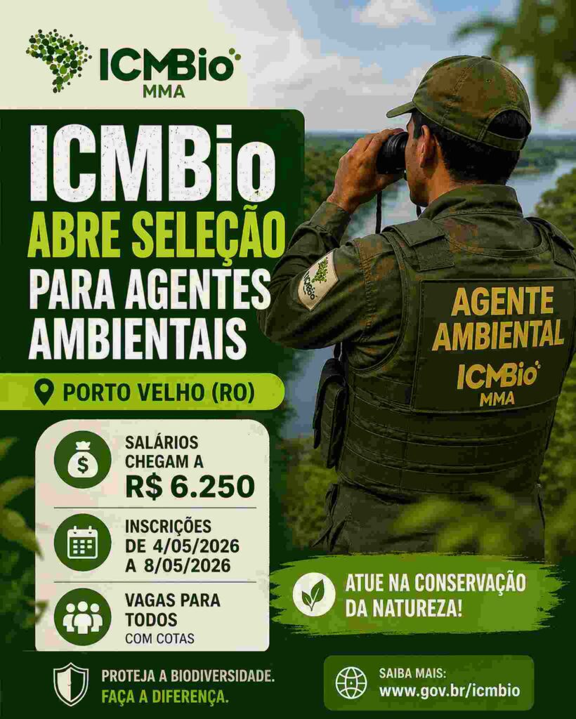 O Instituto Chico Mendes de Conservação da Biodiversidade (ICMBio) abriu as portas para um processo seletivo simplificado destinado a contratar agentes temporários ambientais para o Núcleo de Gestão Integrada em Humaitá, em Porto Velho (RO). As inscrições começam no próximo 4 de maio e seguem até 8 de maio de 2026.