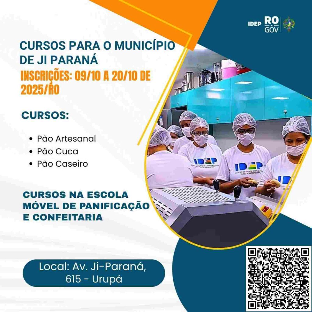 O Governo de Rondônia, por meio do Instituto Estadual de Desenvolvimento da Educação Profissional (IDEP), abriu novas vagas para cursos gratuitos de formação inicial na área de panificação e confeitaria no município de Ji-Paraná. As aulas serão realizadas presencialmente na Avenida Ji-Paraná, nº 615, bairro Urupá.
