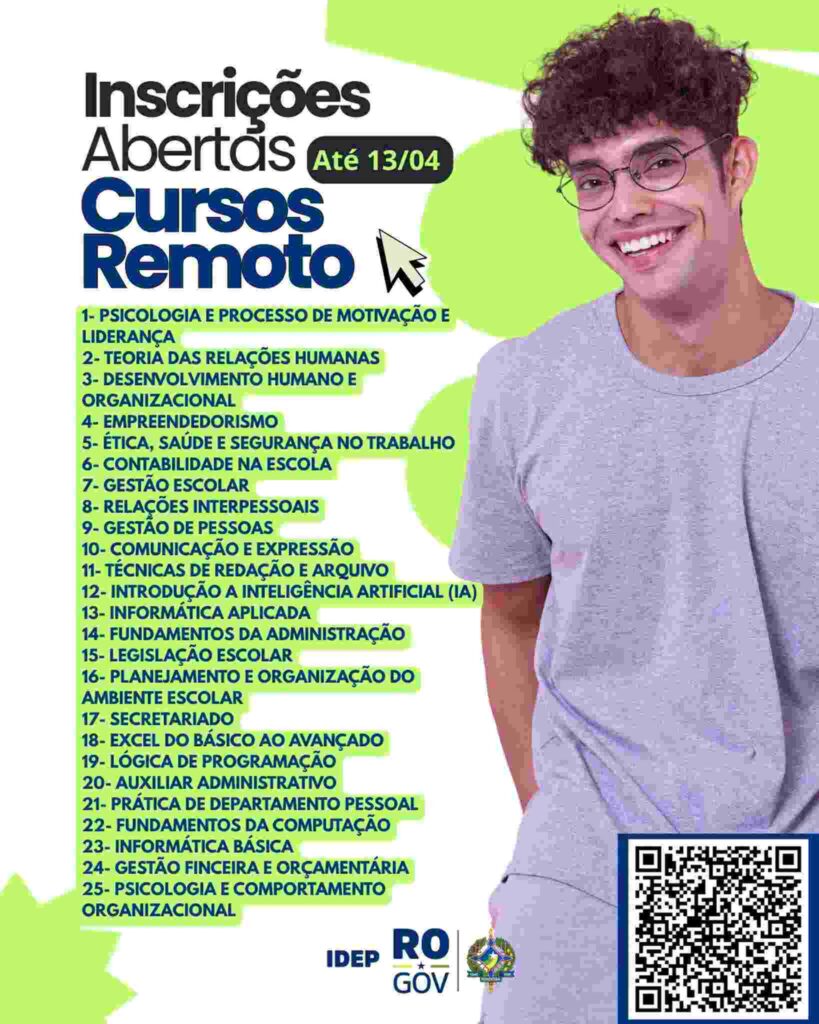 O Instituto Estadual de Desenvolvimento da Educação Profissional de Rondônia (IDEP) publica a Chamada Pública 05-2026 com 30 cursos de qualificação profissional gratuitos, totalmente remotos, com até 50 vagas cada e cadastro reserva.