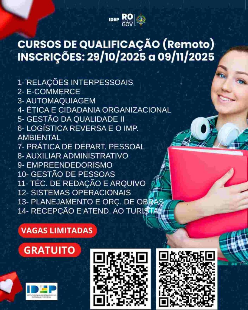 O Instituto Estadual de Desenvolvimento da Educação Profissional de Rondônia (IDEP) anunciou a abertura das inscrições para cursos gratuitos de qualificação profissional, na modalidade remota, voltados à formação inicial e continuada em diversas áreas. As inscrições podem ser realizadas entre os dias 29 de outubro e 9 de novembro de 2025, exclusivamente pela internet.