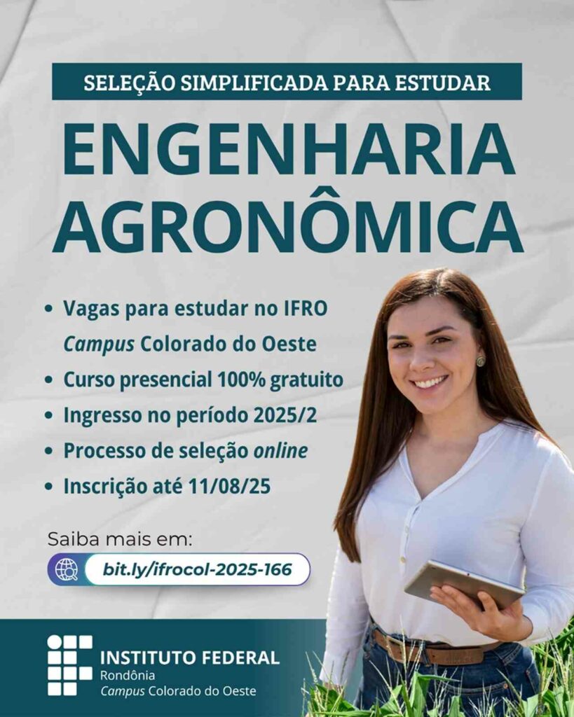 O Instituto Federal de Rondônia (IFRO) lançou o EDITAL Nº 166/2025/COL – CGAB/IFRO para preenchimento de vagas remanescentes no curso de Bacharelado em Engenharia Agronômica, presencial, no Campus Colorado do Oeste.