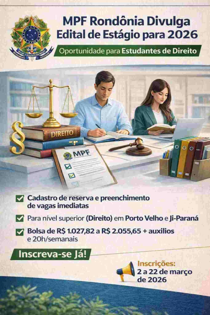 O Ministério Público Federal em Rondônia publicou o edital para o primeiro processo seletivo de estágio de 2026. A seleção é voltada para a formação de cadastro de reserva e preenchimento de vagas imediatas para estudantes de nível superior. As oportunidades para universitários contemplam alunos de graduação e pós-graduação na área de Direito.