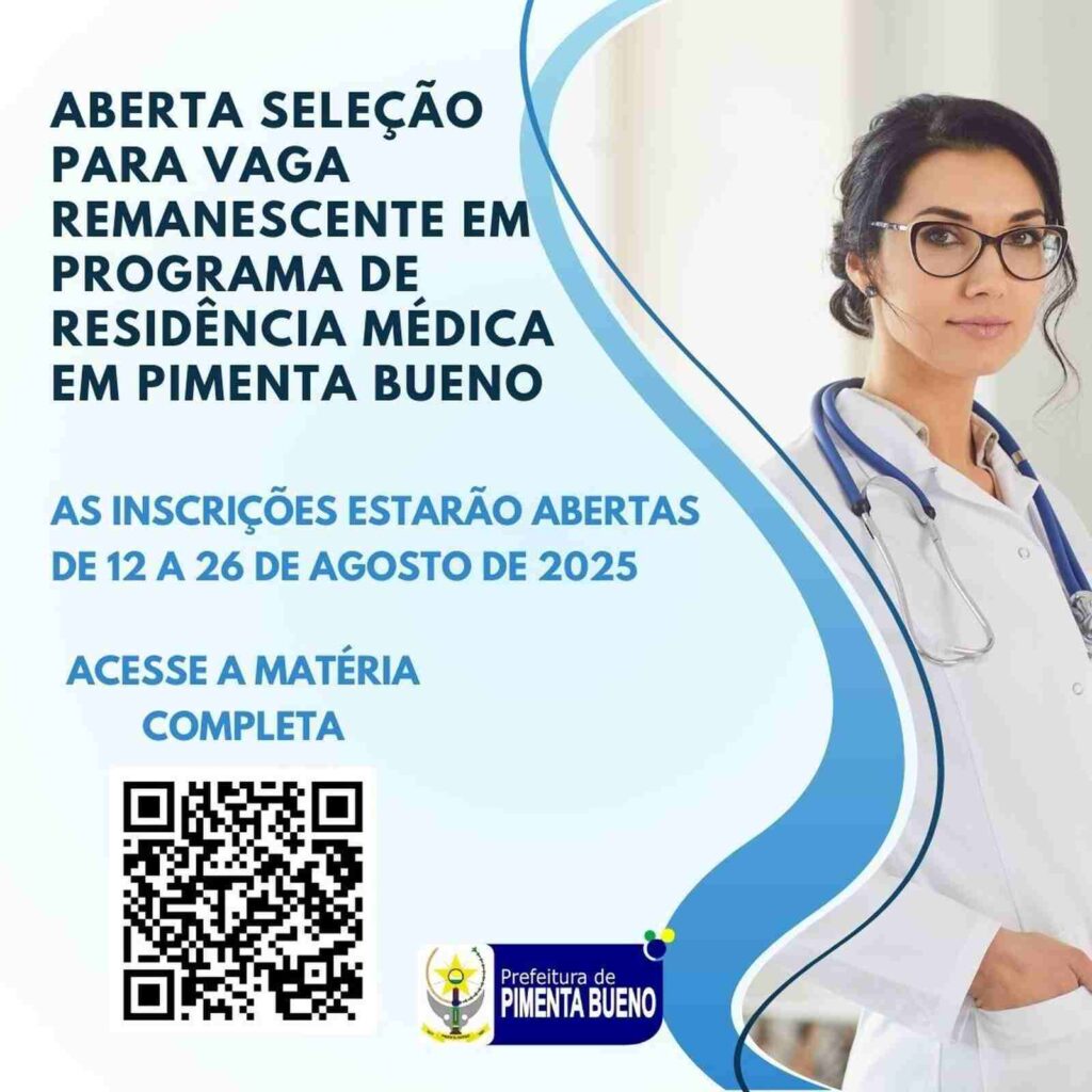 A Prefeitura de Pimenta Bueno (RO), por meio da Secretaria Municipal de Saúde, publicou o Edital COREME nº 01/2025 para seleção de candidatos à vaga remanescente no Programa de Residência Médica em Medicina de Família e Comunidade.