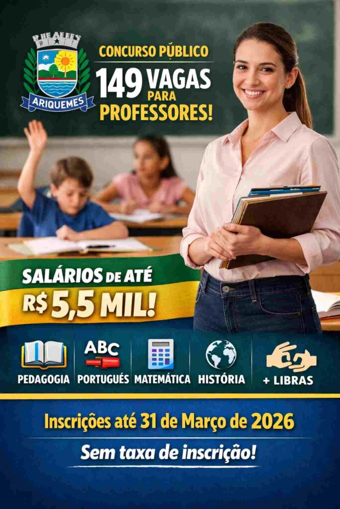 A Prefeitura de Ariquemes, em Rondônia, oficializou a abertura de dois novos processos de concurso público destinados ao preenchimento de cargos efetivos na Secretaria Municipal de Educação (SEMED). As oportunidades são voltadas para profissionais de nível superior no cargo de Professor Nível III, contemplando diversas especialidades e oferecendo remunerações iniciais que podem chegar a R$ 5.597,94, além dos benefícios previstos no plano de carreira pública municipal.
