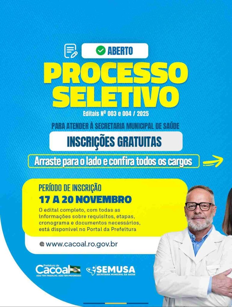 Cacoal, Rondônia – A Prefeitura de Cacoal, através da Secretaria Municipal de Administração (SEMAD), publicou o edital para um Teste Seletivo Simplificado (nº 003/2025/PMC/SEMAD/RO) destinado à contratação temporária de profissionais da área médica. A medida visa suprir a demanda emergencial por profissionais e garantir a continuidade dos serviços de saúde no município, em função da suspensão judicial de um concurso público anterior.