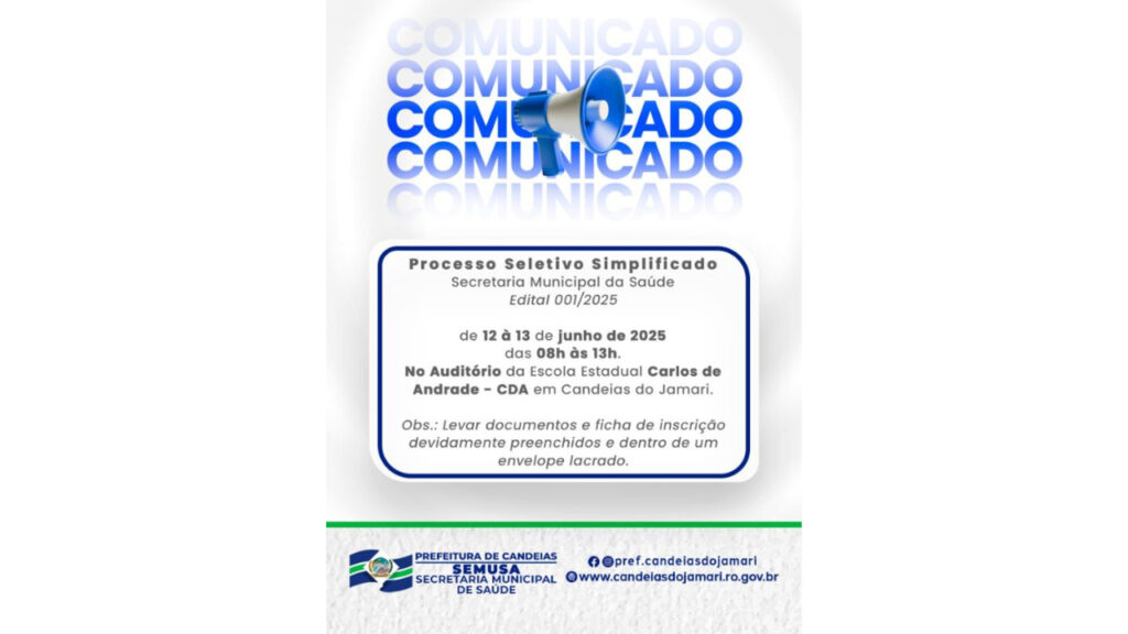 A Prefeitura de Candeias do Jamari, por meio da Secretaria Municipal de Saúde (SEMUSA), lançou o edital nº 001/2025-SEMUSA para contratação temporária de profissionais da saúde. O processo seletivo simplificado visa suprir demandas emergenciais nas unidades municipais de saúde, com lotação tanto na sede do município quanto nos distritos e zona rural.
