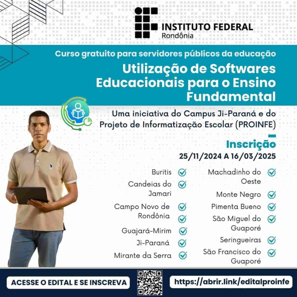 O Instituto Federal de Educação, Ciência e Tecnologia de Rondônia (IFRO), Campus Ji-Paraná, está com inscrições abertas para o Curso de Formação Continuada (FIC) em Utilização de Softwares Educacionais para o Ensino Fundamental.