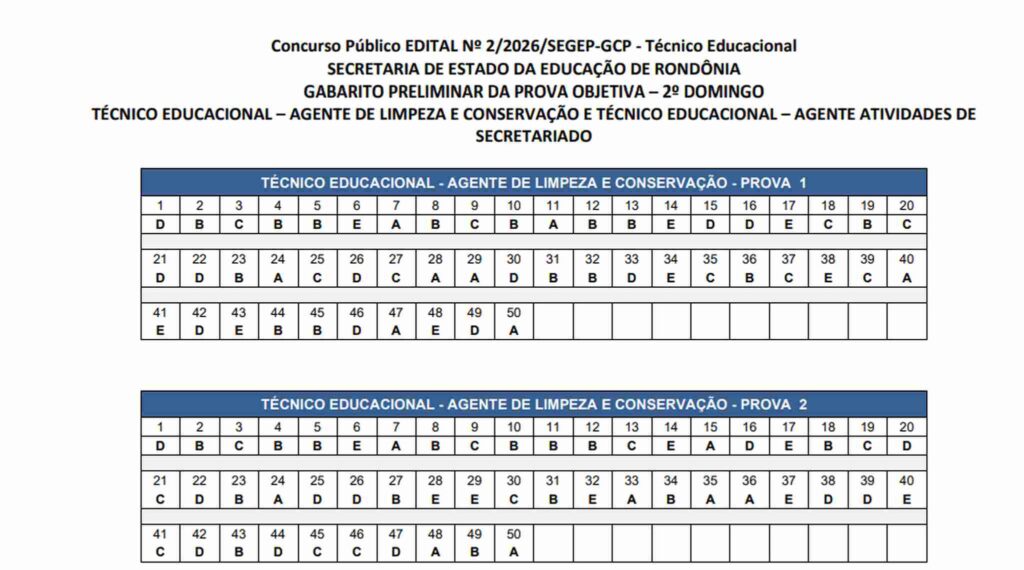 O Instituto Brasileiro de Apoio e Desenvolvimento Executivo (IBADE) publicou, nesta terça-feira (17), os gabaritos preliminares das provas objetivas referentes ao segundo domingo de aplicação do concurso da Secretaria de Estado da Educação de Rondônia (SEDUC-RO). A divulgação é voltada especificamente para os candidatos aos cargos de nível médio que realizaram os exames no último dia 15 de março.