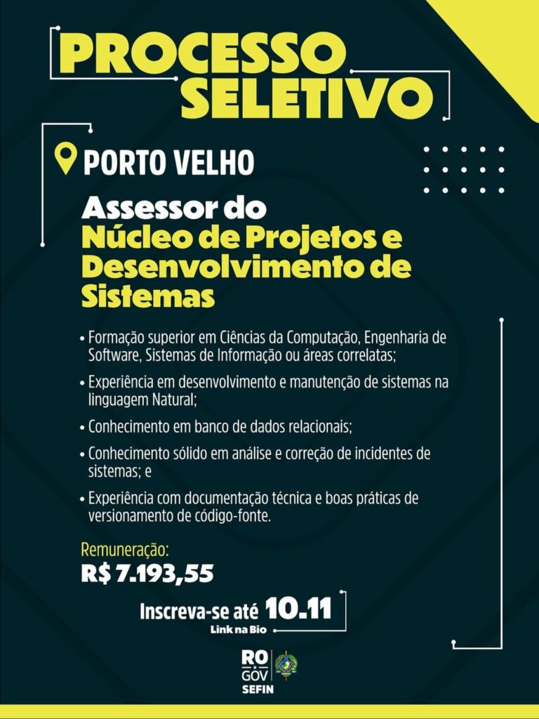 A Secretaria de Finanças de Rondônia (SEFIN) está com inscrições abertas até 10 de novembro de 2025 para o processo seletivo que oferece oportunidade para o cargo de Assessor do Núcleo de Projetos e Desenvolvimento de Sistemas, com atuação presencial em Porto Velho. A seleção é voltada a profissionais da área de tecnologia com experiência em desenvolvimento de sistemas, análise de incidentes e integração de plataformas.