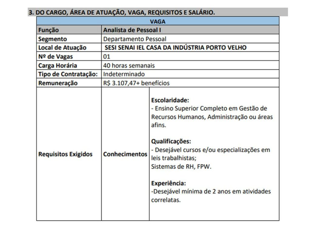 O Serviço Social da Indústria (SESI) anunciou a abertura das inscrições para o cargo de Analista de Pessoal I, uma excelente oportunidade para profissionais que desejam atuar no departamento regional em Porto Velho, Rondônia.