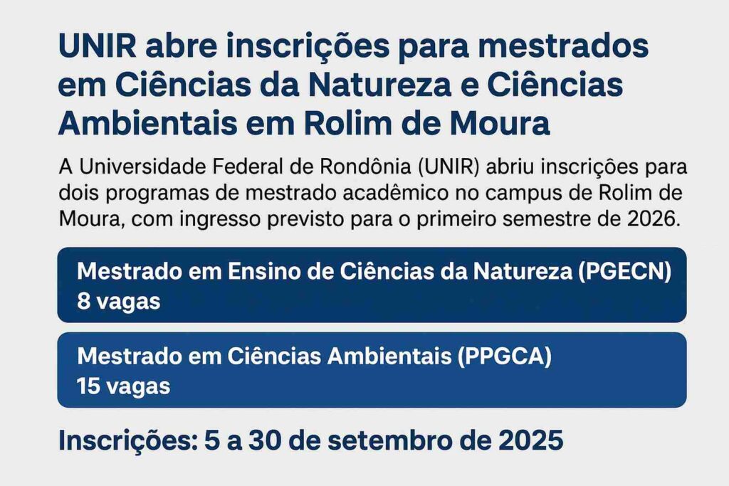 A Universidade Federal de Rondônia (UNIR) abriu inscrições para dois programas de mestrado acadêmico no campus de Rolim de Moura, com ingresso previsto para o primeiro semestre de 2026. São ofertadas 23 vagas no total, distribuídas entre o Programa de Pós-Graduação em Ensino de Ciências da Natureza (PGECN) e o Programa de Pós-Graduação em Ciências Ambientais (PPGCA).