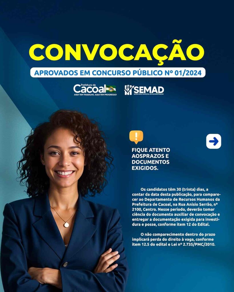 A Prefeitura de Cacoal (RO) publicou nesta terça-feira (22) a primeira convocação dos candidatos aprovados no concurso público regido pelo edital nº 01/2024.